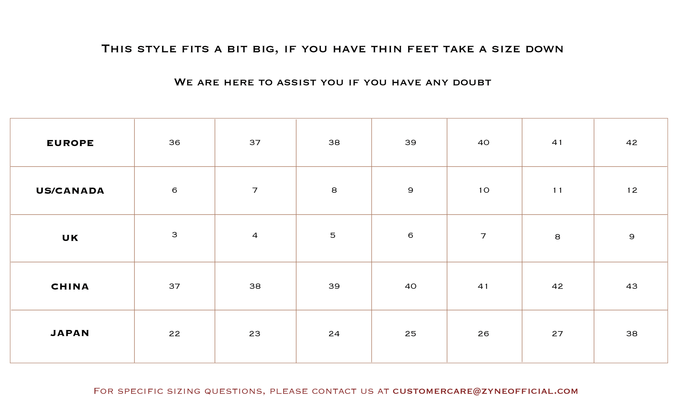 We want you to love your brand new zyne shoes, and we'll do our best to make that happen. The customer service team at ZYNE is more than happy to help with any questions or concerns you may have about sizing before purchase.