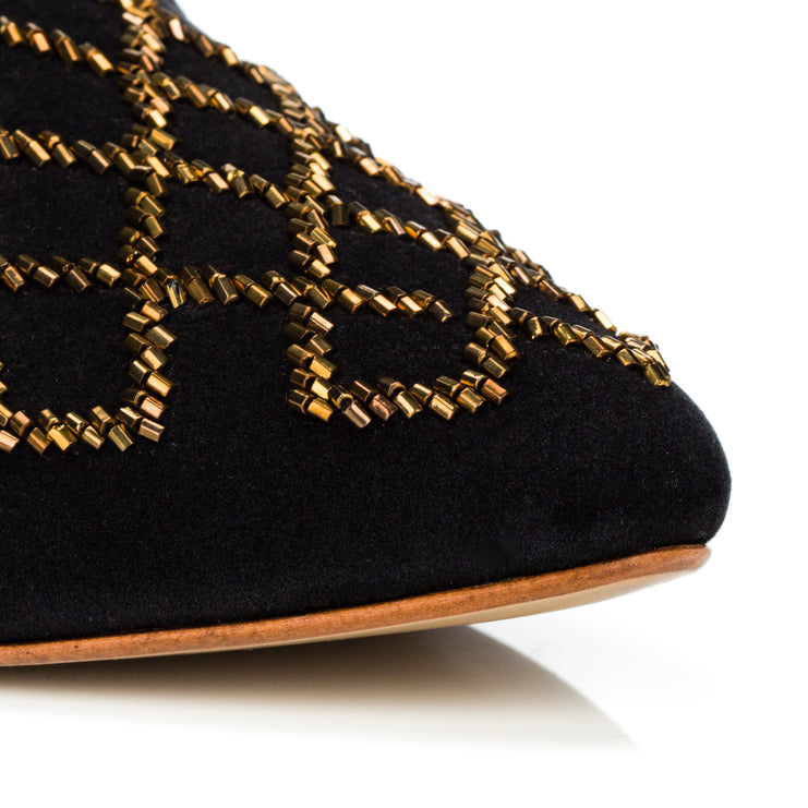 Jacquard is a timeless slipper crafted in velvet and adorned with a sculptural, hand-beaded design. Effortlessly chic, it adds a refined touch to any outfit—from daytime ease to evening elegance.